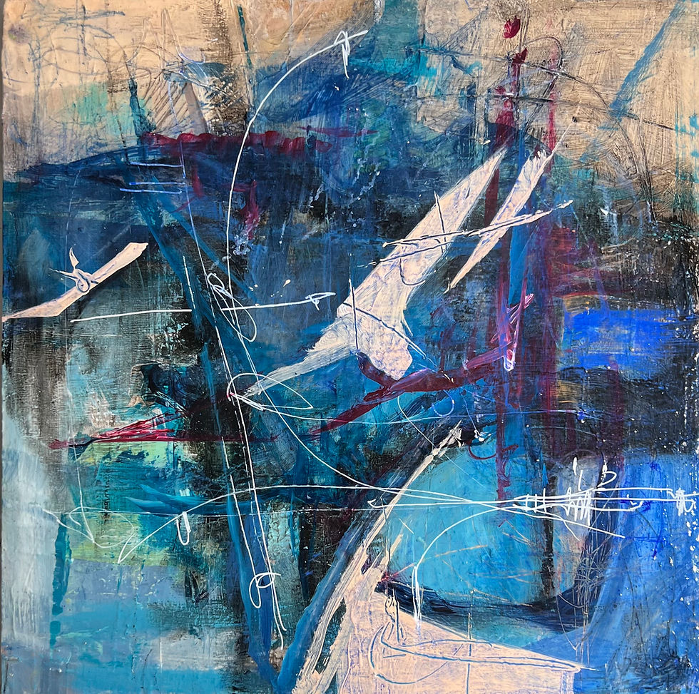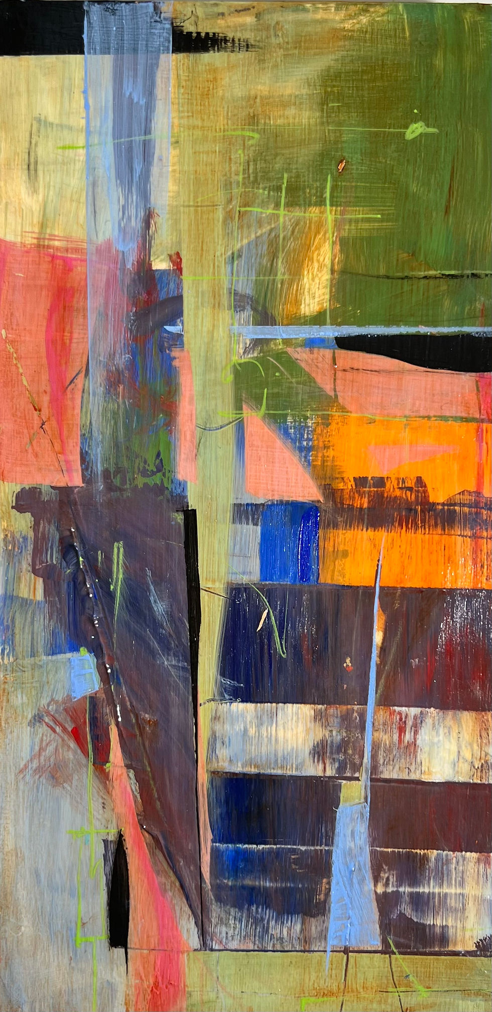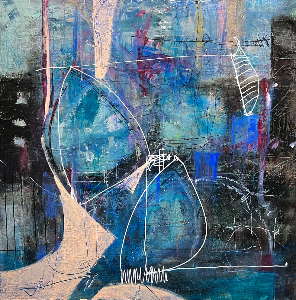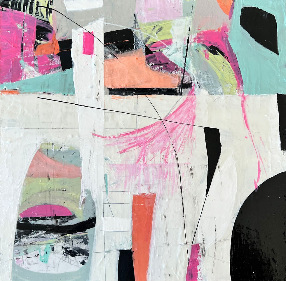 Her abstract paintings explore the balance between structure and spontaneity, geometry and gesture. Each piece is layered and process-driven, shaped through editing, discovery, and trust. Architectural forms mingle with organic marks, softened by texture and grounded in color. What emerges is a dialogue between control and surrender, between the seen and the felt.